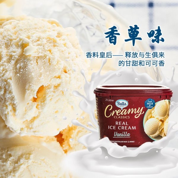 Bulla冰淇淋 Bulla(布拉),是澳大利亚家族乳业,始于1910年的墨尔本,产品涉及冰淇淋、酸奶、酸奶油和奶酪等。由家族5代经营至今历经百年传承,Bulla布拉地处澳洲黄金牧场,远离工业和环境污染。牛奶采集当天直送从牧场到工厂,加工后零下18℃冷冻锁鲜。Bulla鲜奶冰淇淋,以澳洲黄金牧场鲜奶为原料,辅以牛奶巧克力外壳,多种美味的交汇融合,带给你澳洲新鲜纯净牛奶的天然原始醇香。